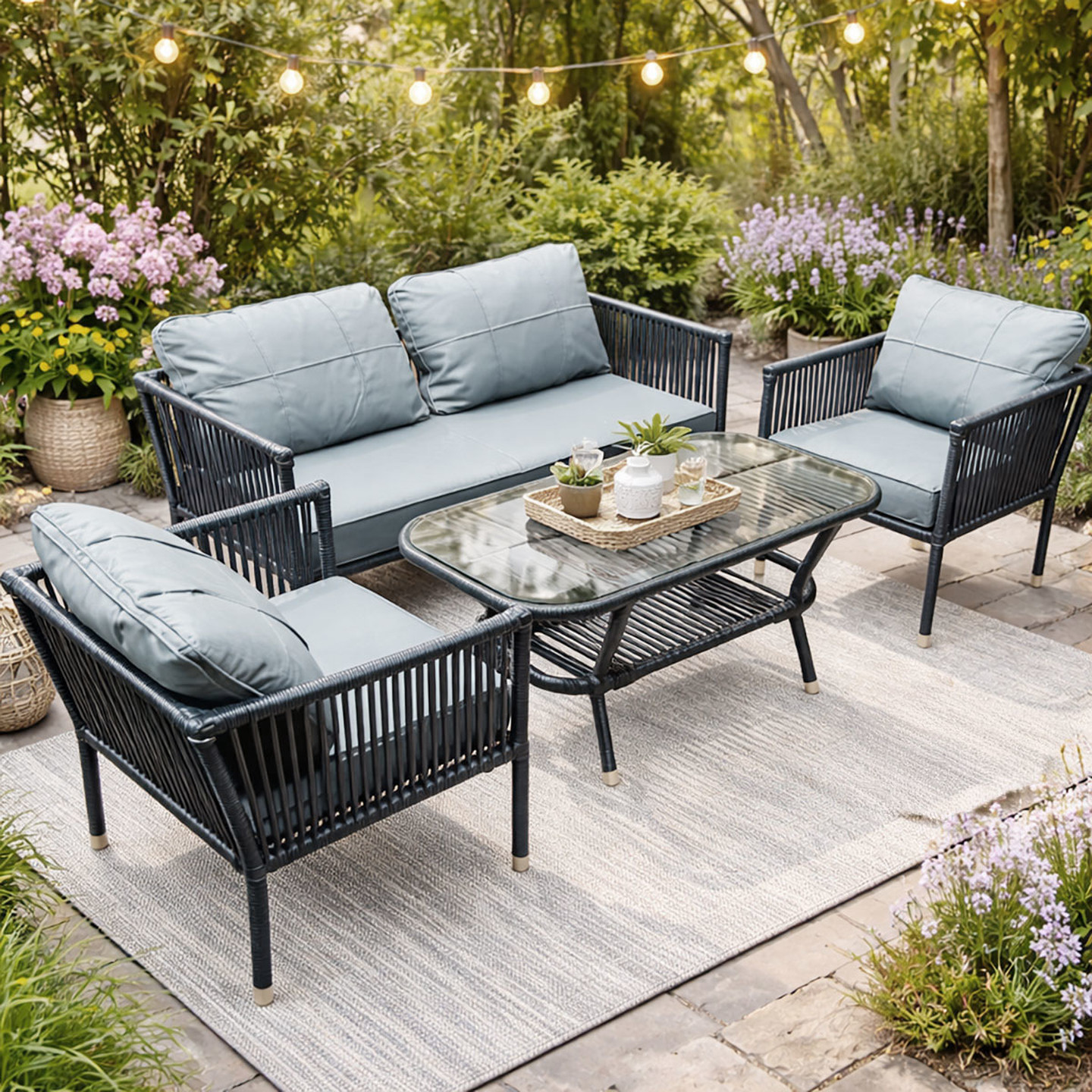 Zarif antrasit rengi ve modern rattan dokusu ile dış mekân dekorasyonunuza şıklık katar. Hem klasik hem modern bahçe mobilyalarıyla uyum sağlar.