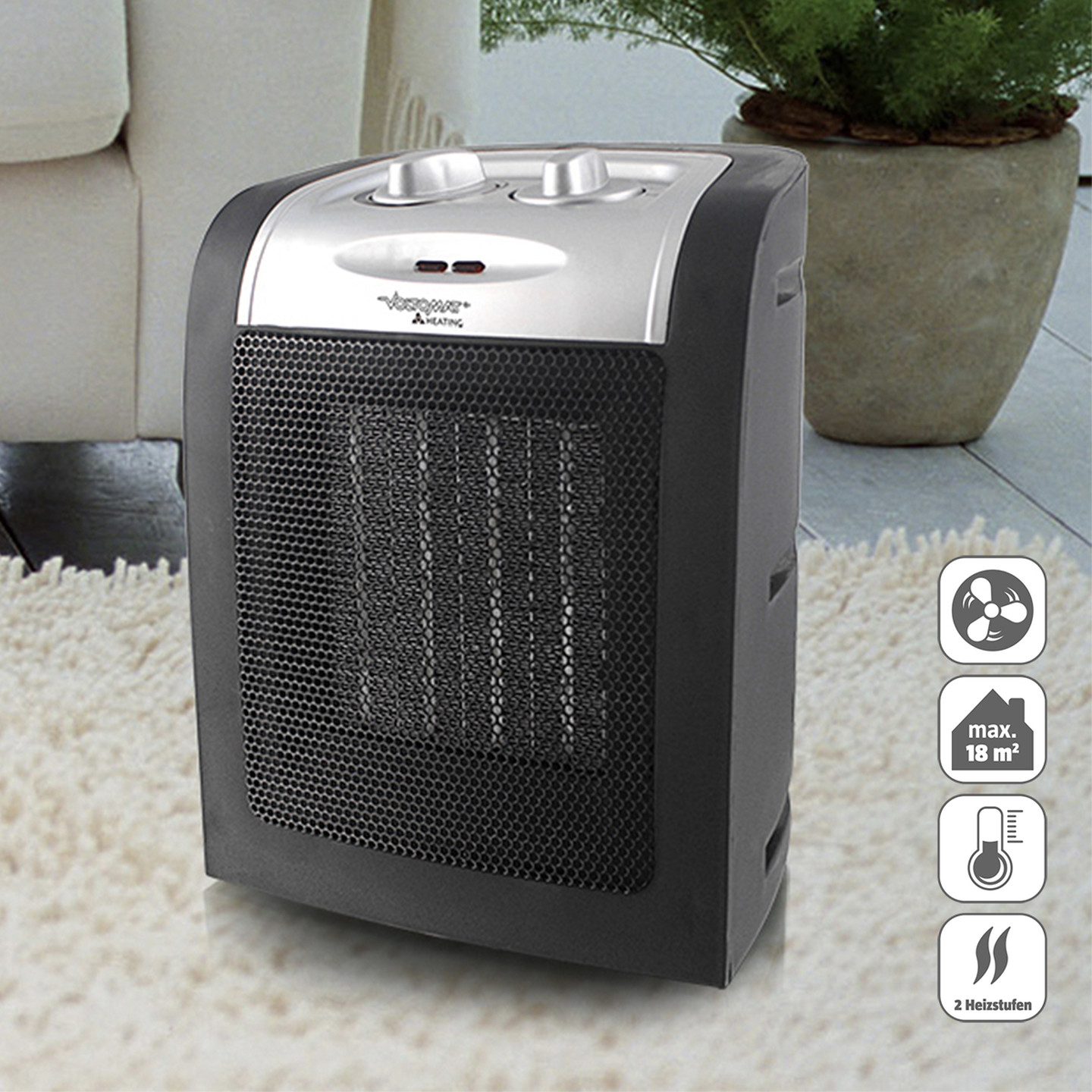 Maksimum 1.800 Watt ısıtma gücüyle, yaklaşık 18 m²'ye kadar olan alanları hızlı bir şekilde ısıtır.